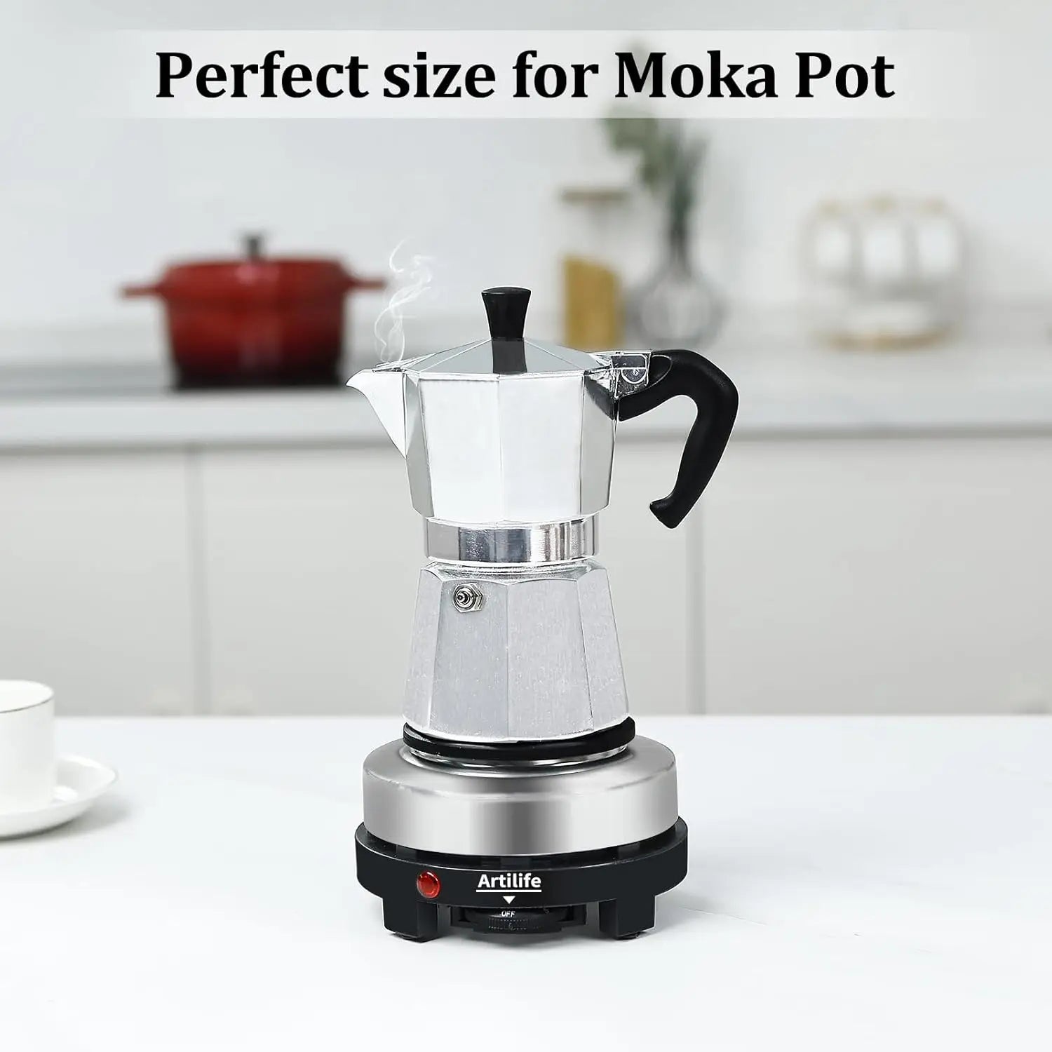 Power up quick and brew cafe-grade warmth anywhere with this 500W Mini Hot Plate for a Moka pot and small meals.